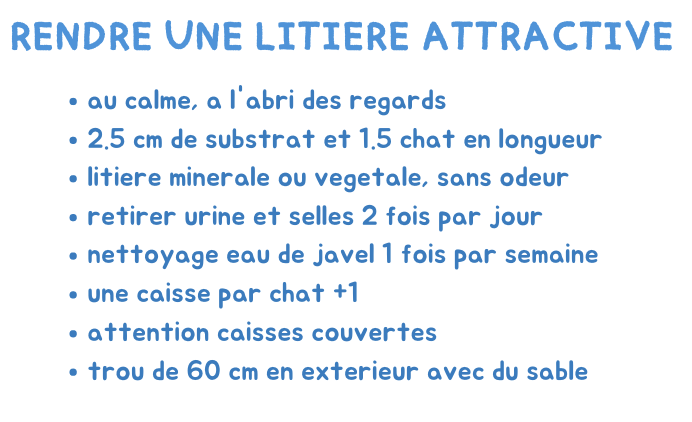 - malpropreté ( causes : une litière pour plusieurs chats, caisse mal adaptée et mal nettoyée),