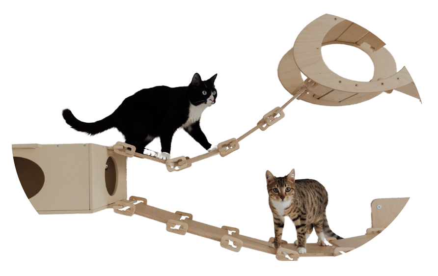 Ce type de parcours est enrichi avec des étagères, des cordes, des griffoirs, vous pouvez même insérer des tunnels avec un jeu à l'intérieur.