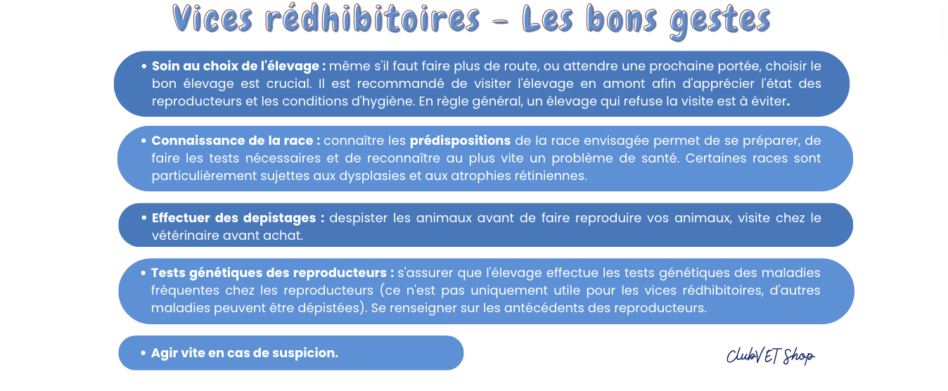 - Tests génétiques des reproducteurs : s'assurer que l'élevage effectue les tests génétiques des maladies fréquentes chez les reproducteurs (ce n'est pas uniquement utile pour les vices rédhibitoires, d'autres maladies peuvent être dépistées).