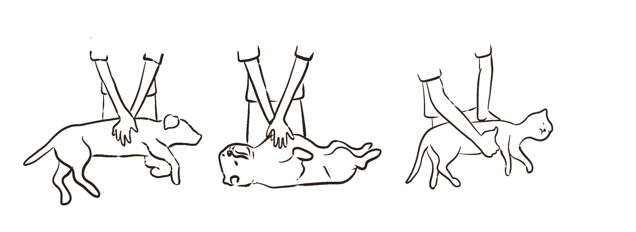 - Couchez l'animal sur le côté sur une surface plane, si vous êtes dans un endroit dangereux, placez-vous d'abord en sécurité,