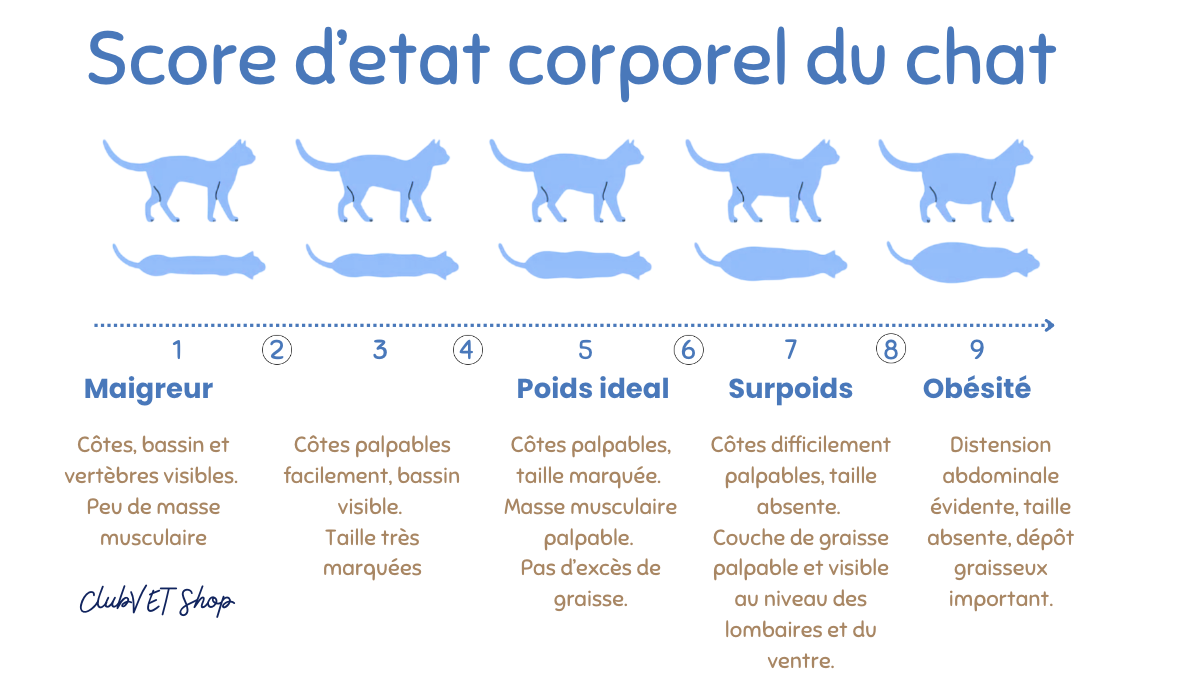 - 6 à 9 : Chat en surpoids à obèse, avec des dépôts de graisse évidents sur l'abdomen, les côtes difficiles à palper et une forme ovale à ronde du dessus.