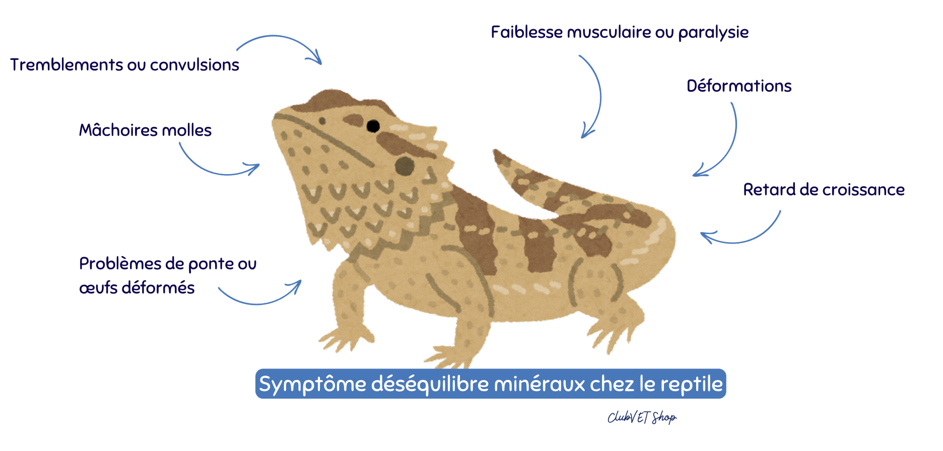 Cette pathologie est fréquente chez les reptiles en captivité et se manifeste par des déformations osseuses, des fractures spontanées, de la léthargie et des tremblements.